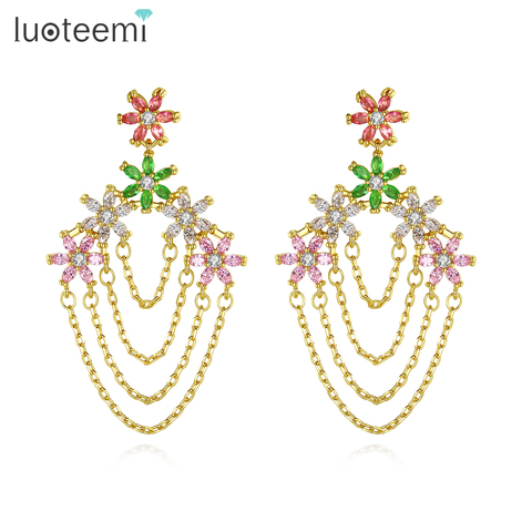 Pendientes LUOTEEMI chapados en oro de lujo Zirconia elegantes pendientes de mujer para mujer pendientes largos colgantes de circonia cúbica para novia