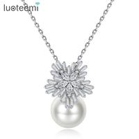 LUOTEEMI Vrouwen Groothandel Europese Elegante Stijl Sieraden Clear CZ Sneeuwvlok Met Grote Witte Parel Kettingen